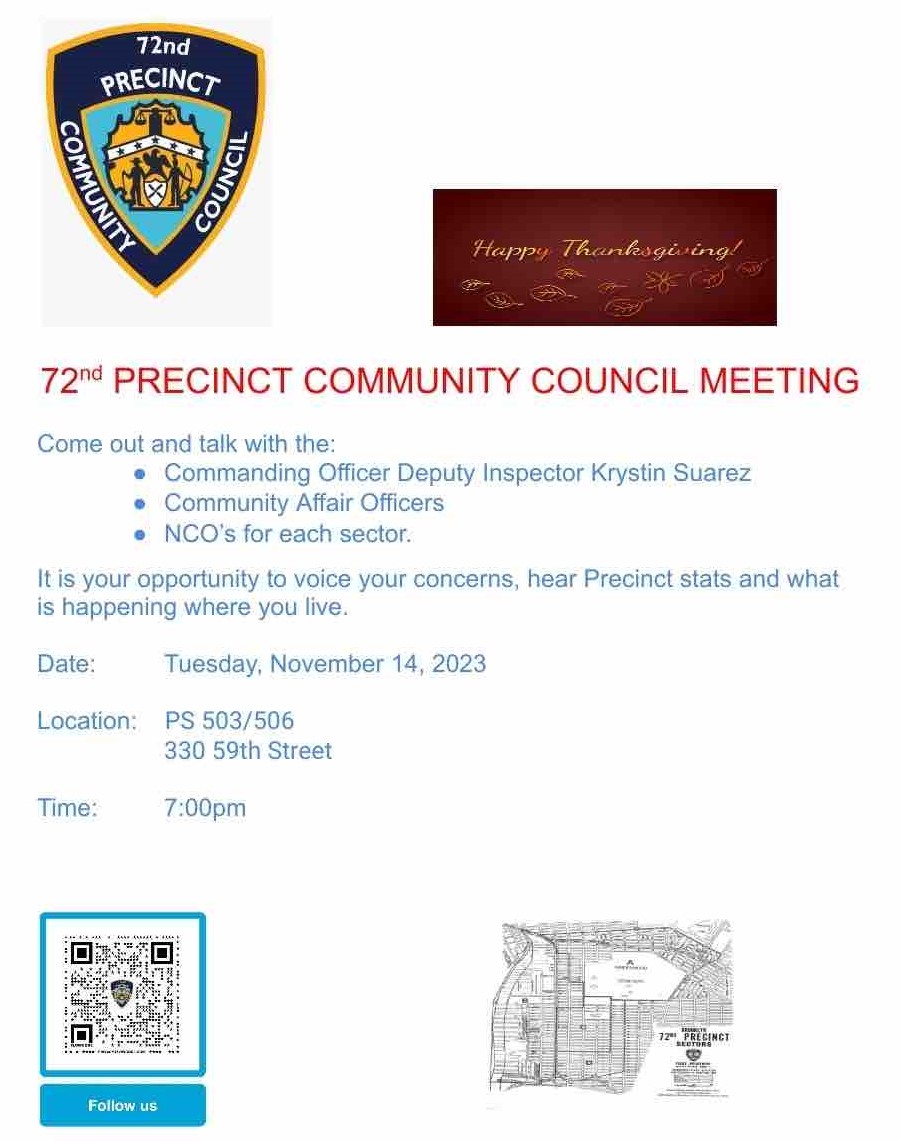 The 72nd Precinct Community Council's next meeting with the public and the NYPD will be held in person on Tuesday, November 14th, from 7:00 p.m. to 8:00 p.m.